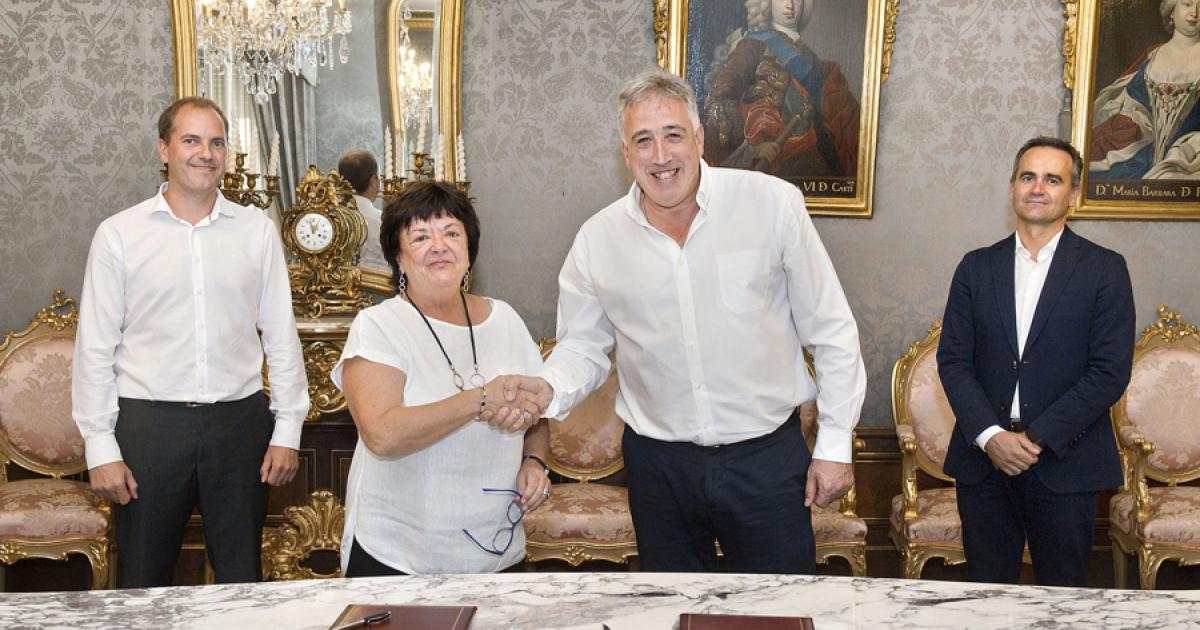 María José Beaumont, consejera de Presidencia, Función Pública, Interior y Justicia y Joseba Asiron, alcalde de Pamplona / Iruña, han firmado, en su calidad de presidentes de Nasertic y Animsa respectivamente, un convenio de colaboración entre ambas sociedades. Los gerentes Iñaki Pinillos (Nasertic) y Txema Aginaga (Animsa) han acompañado a sus presidentes en la firma que se ha llevado a cabo a mediodía de hoy, 18 de septiembre, en el Salón Verde del Palacio de Navarra.
