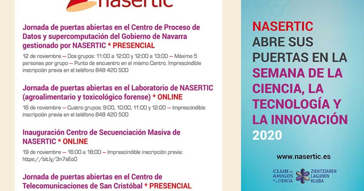 Por otra parte, el próximo 19 de noviembre de 2020 va a tener lugar la inauguración del Centro de Secuenciación masiva de NASERTIC. El evento será de 16:00 a 18:00 horas y podrá ser seguido en streaming. Para ello, las personas interesadas deberán inscribirse on line con sus datos y su correo electrónico en este enlace: https://bit.ly/3n7eEo0 y el día antes del evento recibirán el enlace para conectarse a la jornada.