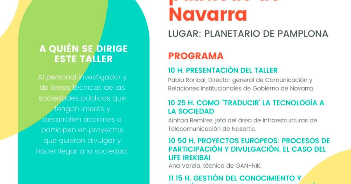 Cinco especialistas procedentes de distintas áreas científico-tecnológicas de las sociedades públicas de Navarra (NSP) impartirán, el próximo martes día 25 de febrero, el I Taller de Divulgación de Ciencia y Tecnología, que tendrá lugar en Planetario de 10 a 13 30 h. y que tiene como objetivo compartir buenas prácticas y crear un espacio para intercambiar experiencias en el ámbito de la divulgación social de la ciencia y la tecnología.