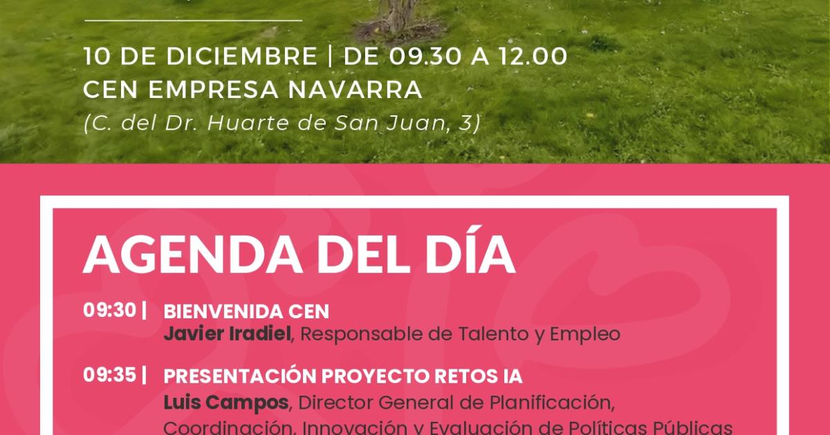Las personas encargadas de ofrecer los detalles del proyecto 'Retos IA', tras la bienvenida de Javier Iradiel, responsable de Talento y Empleo de CEN, serán Luis Campos, director general de Planificación, Coordinación, Innovación y Evaluación de Políticas Públicas; Gorka García, director de NAIR Center, y Juan Carlos Recio, socio director de Beesy.