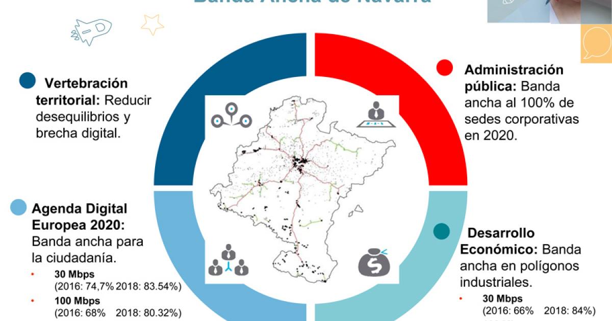 • Ejecución del Plan Director de Banda Ancha. A fin de año, el 82,55% de las empresas situadas en polígonos industriales dispondrá de una conexión de banda ancha, frente al 40,47% de 2016, mientras que en lo que respecta a la ciudadanía el 80,32% de los hogares dispondrá de redes de banda ancha ultrarrápida (68% de 2016). Asimismo, a través de NASERTIC, empresa pública adscrita al Departamento, se ha creado una red mayorista para dar servicio a operadores de telecomunicaciones, fomentando despliegues de banda ancha en zonas rurales.
