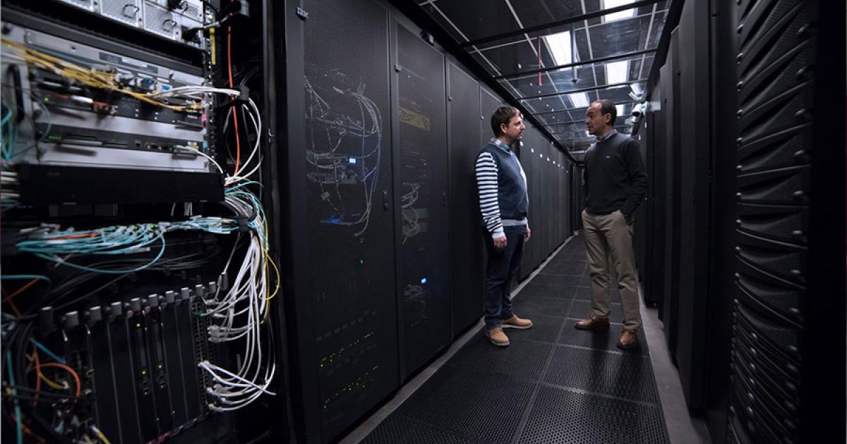 Nos encontramos en el interior de una gran caja de cristal con dos filas de armarios en los que parpadean los pilotos de colores de decenas de procesadores y servidores. Forman un estrecho pasillo, con el zumbido de los sistemas de refrigeración de fondo. Mantener la temperatura adecuada es crucial para evitar cualquier posible avería. La caja se encuentra en una amplia dependencia que era la que albergaba anteriores CPD, pero la miniaturización de los equipos ha reducido drásticamente las necesidades de espacio asignada a los equipos informáticos.