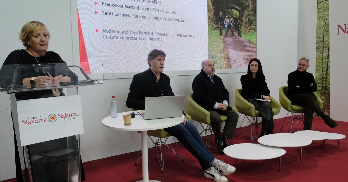 La jornada de este viernes de Navarra en Fitur ha comenzado con la mesa redonda, “¿Qué es para ti un turismo innovador en Navarra?”, moderada por Toya Bernard, directora de Innovación y Cultura Empresarial de Nasertic, en la que han participado Ali Urrusolo, responsable de Cinema Travel, especializada en turismo de Cine; Nacho Calvo, gerente de AEHN, que ha informado sobre la Plataforma de Comercialización de Actividades; Francesca Mariani, del yacimiento de Santa Criz de Eslava, ciudad vascónica y romana de la comarca de Sangüesa, y Santi Lesmes, de Scape Street, que ha presentado la “Ruta por la historia de las mujeres de Navarra”.